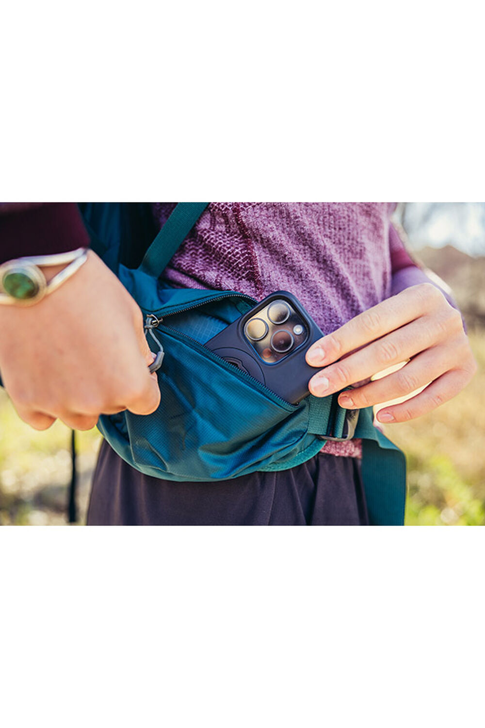 On-The-Go shoulder strap pocket designed for the Garmin inReach®, your favorite trail snack, or sunglasses