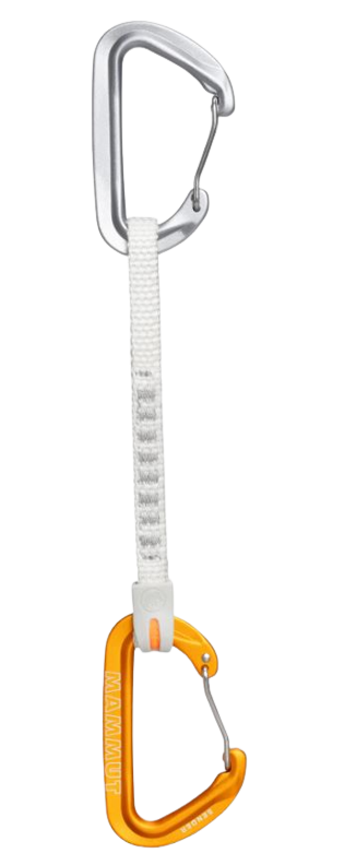 The model uses wire gate carabiners, which offer several important advantages. The lower inertia of wire gates reduces flutter and shutter, and the design continues to function reliably even in snow and ice. This makes the quickdraw suitable for year-round use and particularly useful in colder, more variable mountain conditions.