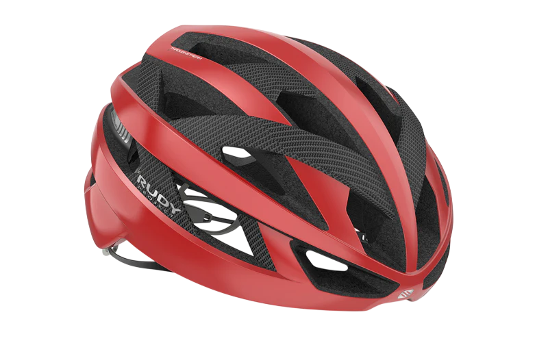 The Rudy Project Rebel cycling helmet sets a new standard in safety, sustainability, and performance. Designed with integrated carbon fiber panels, it enhances structural strength and comfort while reducing the amount of polystyrene (foam) required. This construction lowers overall weight and allows for larger ventilation openings—without compromising safety, and even improving it.