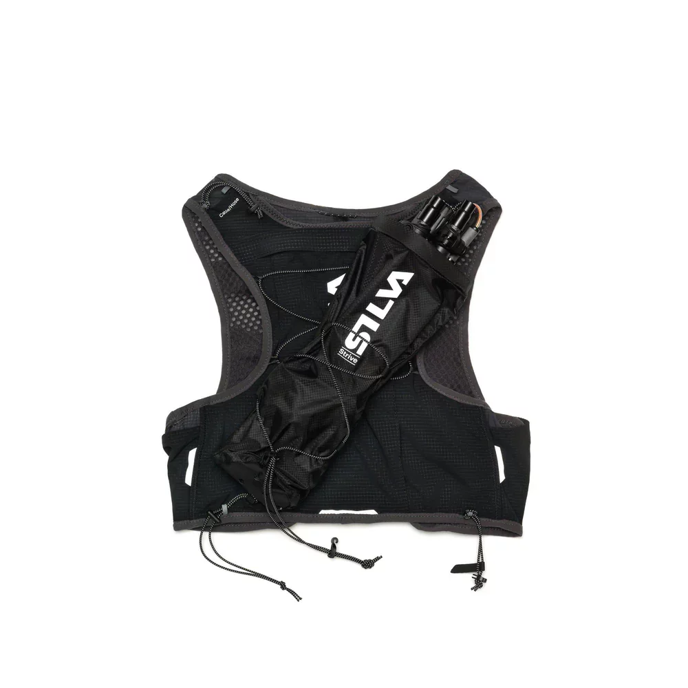 Strive 10 Vest разполага с рефлектори за видимост на тъмно, вградена свирка за спешни ситуации, и ремъци за бегачески щеки. Можете да закрепите челник отпред, а също така раницата е съвместима с крепежа Silva Quiver. Материалът е мек, но издръжлив – комбинация от nylon и elastane за тялото и полиестер отпред. Чистенето става на ръка.